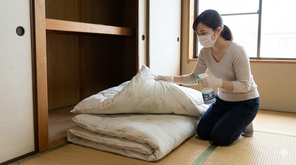 まず、目に見えるカビの黒い点やシミがあるかチェックします。布団の裏側や、床に接していた面、折り目の部分など、湿気がたまりやすい場所を重点的に見てみてください。表面だけの軽いカビなら、消毒用エタノールをスプレーして、清潔な布で軽く押さえるように拭き取り、そのあとしっかり乾燥させます。