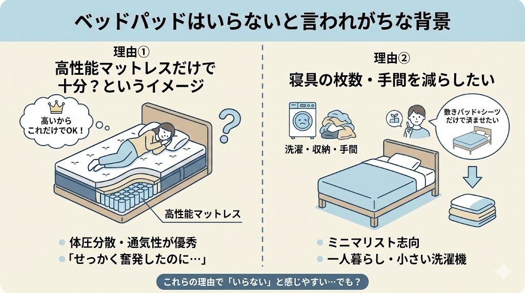 まずは、そもそもなぜ「ベッドパットはいらない」と言われがちなのか、その背景を整理しながら、本来ベッドパッドが担っている役割を押さえていきます。ここを理解しておくと、自分にとって必要かどうかを冷静に判断しやすくなります。「なんとなくいらない気がする」ではなく、「自分の環境だと、こういう理由で要る・要らない」と言えるところまで一緒に整理していきましょう。