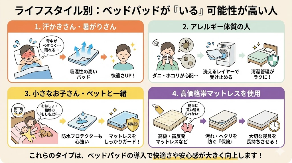 じゃあ、具体的にどんな人にはベッドパッドが「いる」可能性が高いのか。私が相談を受ける中で、特におすすめしやすいのは次のようなタイプです。