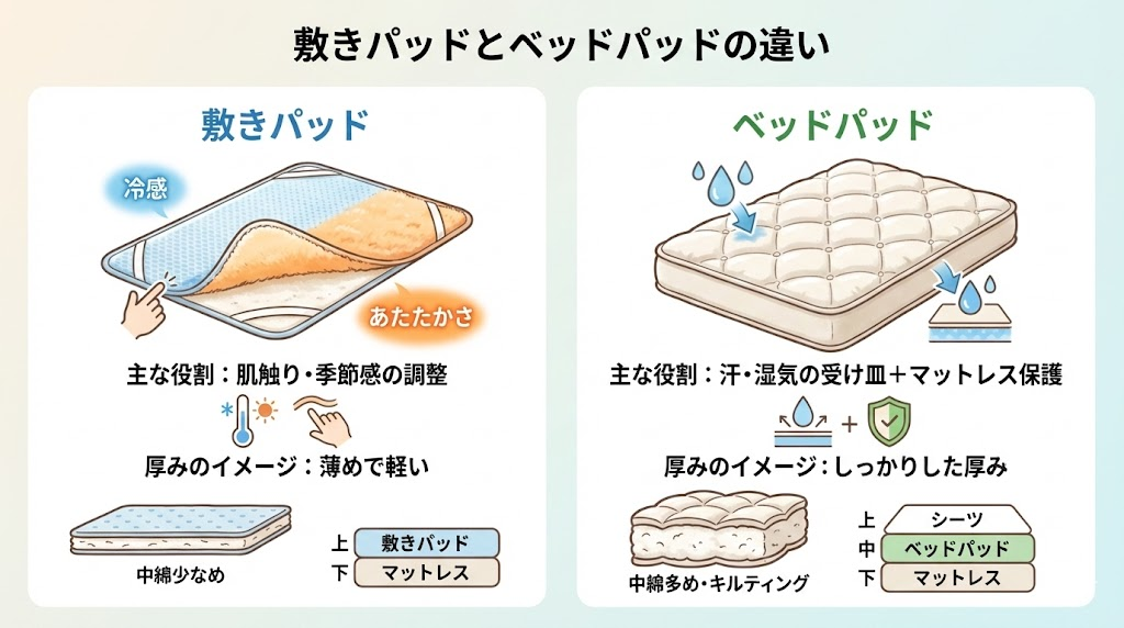ざっくり言うと、敷きパッドは「肌触りと季節感の調整」がメイン、ベッドパッドは「汗を受け止めてマットレスを守る」のがメイン、というイメージです。どちらも「上に敷くもの」ではあるのですが、役割の優先順位が違うんですよね。