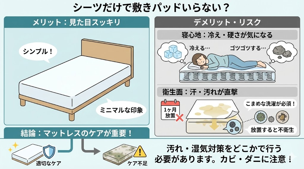 まずよく見かけるのが、「敷きパッドだけでシーツはいらない」「シーツだけで敷きパッドはいらない」という極端なパターンです。これも、まったくダメというわけではありませんが、メリットとリスクを整理しておいた方が安心です。ここ、気になりますよね。