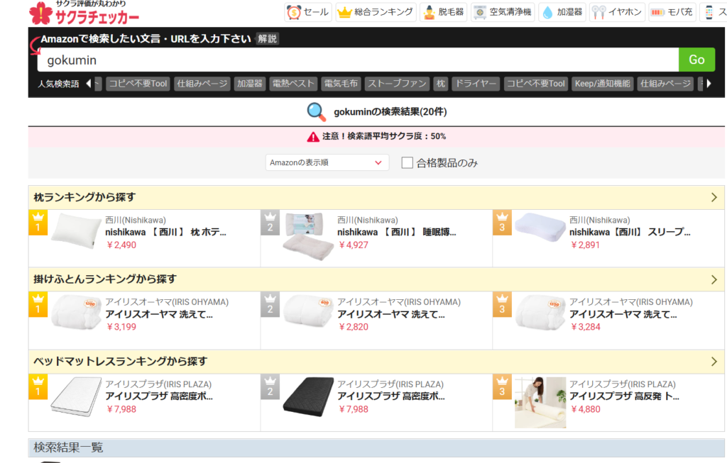 GOKUMINマットレスを調べると、サクラチェッカーで「サクラ度が高い」「危険」などと出てくることがあり、それが「GOKUMINは怪しい」という噂につながっています。検索結果に赤い警告マークが出てくると、ちょっとドキッとしますよね。