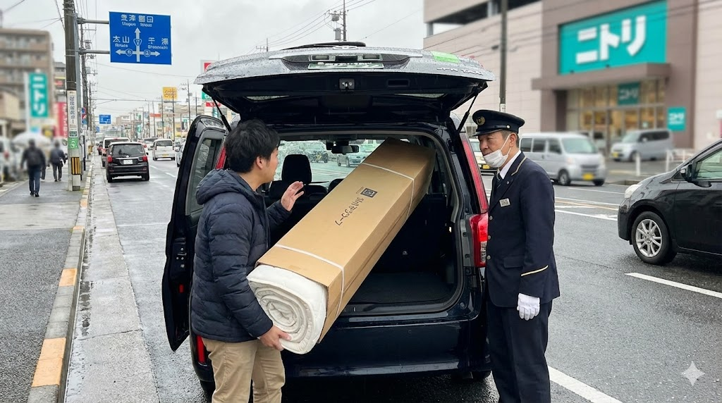 自分の車がない場合、「タクシーで持ち帰る」という選択肢も頭に浮かぶと思います。ここも、実際のところどうなのか気になりますよね。ただ、最近主流のJPN TAXIタイプはラゲッジがそこまで広くなく、ダブルなど長さが1m50cm級になると積み込みがかなりシビアです。
