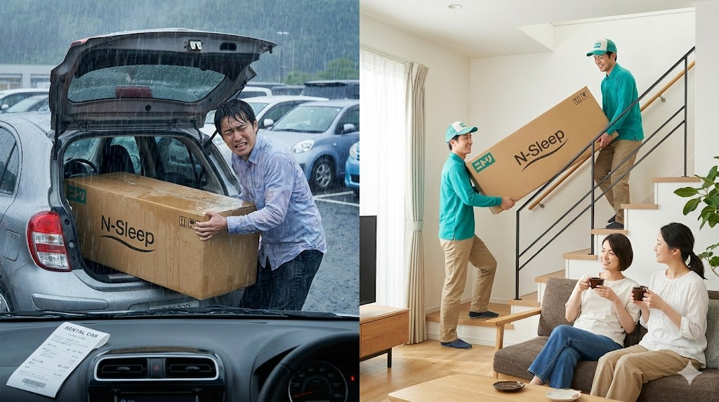 そのため、現在は「軽トラ貸出あり=マットレスを自分で運びやすくするサポート」がある店舗もあれば、「貸出なし=自家用車か有料配送を選ぶ」しかない店舗もある、というイメージです。もし軽トラックのレンタルも視野に入れているなら、