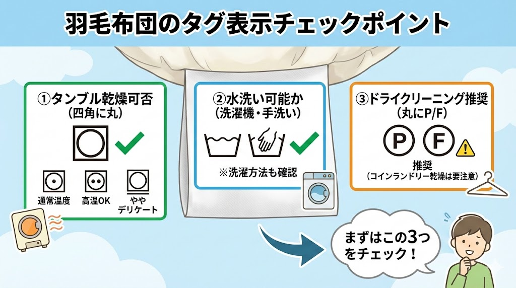 このパートでは、洗濯表示やキルティング構造、生地の状態から「乾燥機OKかどうか」を見きわめるポイントと、よくある失敗パターンを整理していきます。最初にしっかり準備をしておけば、このあと解説する羽毛布団コインランドリー乾燥のみのテクニックも、グッと生きてきますよ。