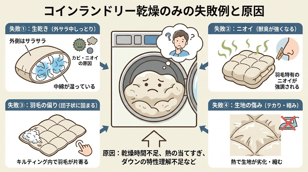 羽毛布団コインランドリー乾燥のみの相談で多いのが、「ふわふわになると思って乾燥機に入れたら、臭いが出た」「中身が偏ってしまった」という失敗談です。SNSなどを見ていても、「乾燥のみでやってみたら失敗した…」という声はちらほらあります。ここでは代表的な失敗パターンと、その対策を整理します。先に予習しておくことで、同じ落とし穴にハマる確率をかなり下げられますよ。