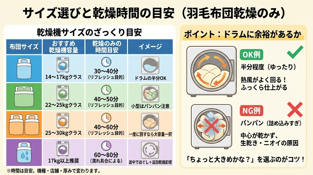 羽毛布団コインランドリー乾燥のみをするときに、もう一つ大事なのが乾燥機のサイズ選びです。これはふわふわ感だけでなく、乾き具合にも直結します。「空いているから」といって小さめの乾燥機に無理やり押し込むと、熱風が布団の奥まで届かず、生乾きとムラの原因になります。ここでは、サイズ選びと時間の目安をセットでイメージできるように整理していきます。