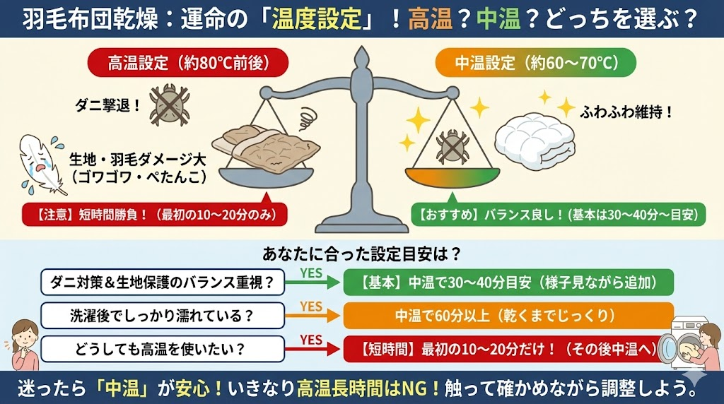 多くの場合、中温設定(イメージとして60〜70℃程度)が、ダニ対策と生地のダメージを両立しやすいバランスの良いラインです。高温設定が80℃前後になる機種もあり、長時間回すと羽毛の油分が抜けてゴワゴワになったり、側生地が傷むリスクが高まります。羽毛はケラチンタンパク質と油分で成り立っているので、熱をかけすぎるとしなやかさが失われてしまうんですよね。