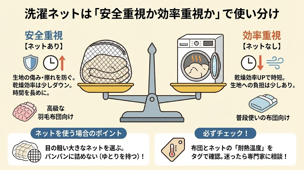 洗濯ネットに入れると、生地の擦れやファスナーとの接触キズを防ぎやすい一方で、乾燥効率は少し落ちます。大きな布団用ネットや専用ネットがある場合は、