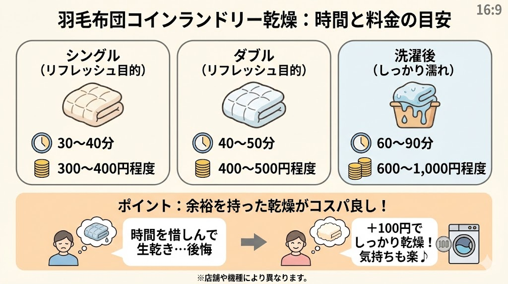 羽毛布団コインランドリー乾燥のみをするときに現実的に気になるのが、「何分くらい回せばいいのか」と「いくらかかるのか」ですよね。コインランドリーに行くと、乾燥機の前で「30分で足りるかな…いや、40分かな…」と悩んでいる人をよく見かけます。ここでは、あくまで一般的な目安として、時間と料金のイメージを整理しておきます。