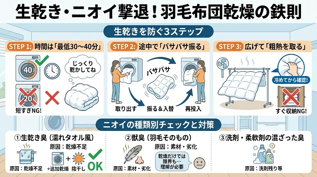 ニオイ対策やダニ対策を中心に知りたい場合は、布団の匂いと乾燥機の活用法をまとめた布団の匂いを消すコインランドリーと乾燥機活用マニュアルも参考になると思います。ニオイの原因が「生乾き」なのか「羽毛そのものの油分」なのかで対処が変わるので、原因の切り分けが大事ですよ。