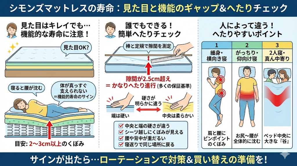 よくあるのが「見た目はまだキレイだけど、寝るとなんとなく腰が沈む」という状態です。これは物理的な寿命ではなく、機能的な寿命が近づいているサインだと考えています。目安としては、目視で2〜3cm以上のくぼみが出てきたり、寝転んだときに体が真っすぐ支えられていない感覚があるなら、シモンズマットレスの寿命が近づいている可能性が高いです。