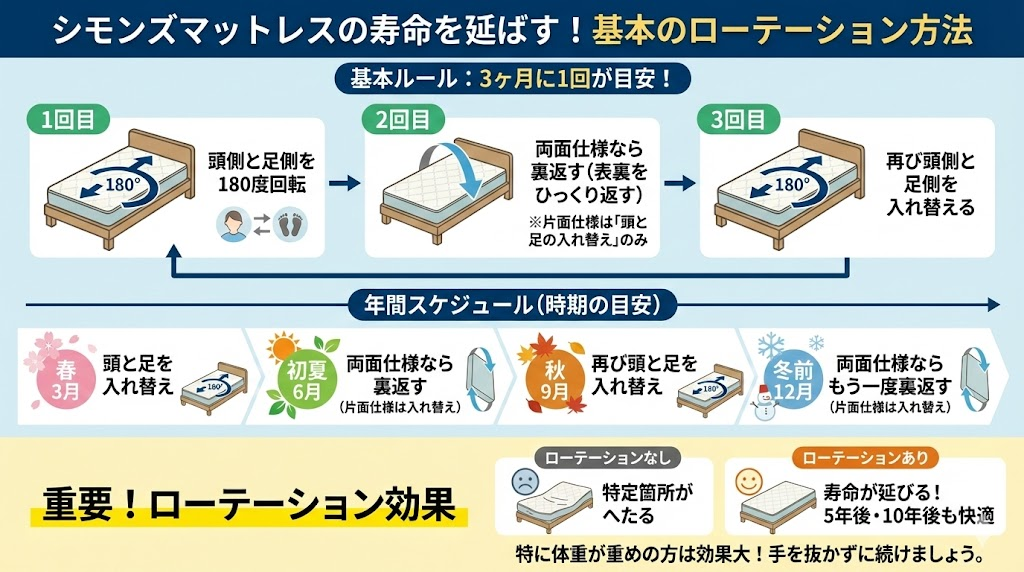 シモンズマットレスの寿命を延ばすうえで、いちばんコスパが良いのがローテーションです。特にシングルやセミダブルは、どうしても同じ場所に体重が集中しやすいので、そのまま使い続けるとへたりが一気に進みます。「なんとなく真ん中だけ柔らかい気がする…」という状態を防ぐために、ぜひ習慣化してほしいメンテナンスです。