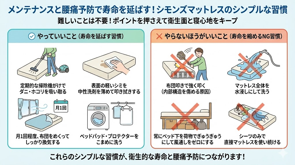 シミやホコリを放置すると、衛生的な意味での寿命が先に来てしまいます。シモンズマットレスの寿命をきちんと使い切るには、腰痛対策も含めた日常的なメンテナンスが欠かせません。ここは「難しいことをたくさんやる」必要はなくて、ポイントを押さえたシンプルな習慣で十分です。