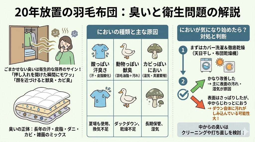 この臭いの正体は、長年しみ込んだ汗や皮脂、ダニやカビ、雑菌など、いろいろなものがミックスされたものです。カバーをいくら洗っても、中身のダウン自体が汚れていると、どうしてもにおいは残りやすいです。濡れ雑巾のような酸っぱいにおい、動物っぽい獣臭、押し入れ独特のカビ臭など、タイプはいろいろですが、どれもあまり長く吸い続けたくないにおいですよね。
