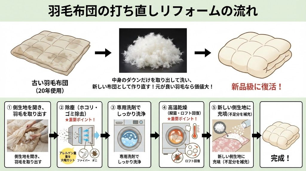 打ち直しリフォームは、「今の羽毛布団を丸ごと洗う」のではなく、「中身のダウンだけを取り出して洗い、新しい布団として作り直すイメージ」です。20年洗っていない羽毛布団でも、元の羽毛の質が良ければ、かなりの確率で新品級のふっくら感を取り戻せます。特に、当時5万円以上したグースダウンの布団なら、今の相場ではなかなか同じものを買い直せないので、打ち直しの価値がぐっと上がります。