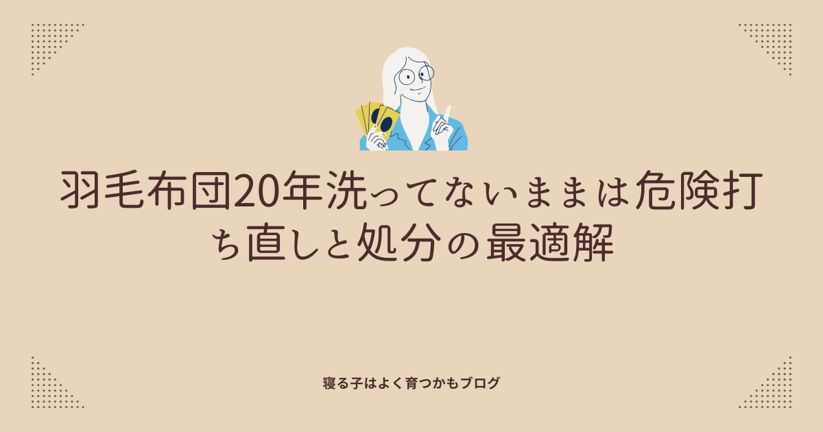 臭い対策や洗い方全般については、布団の匂いを消すコインランドリーと乾燥機活用マニュアルで、コインランドリーを使うときのコツを詳しくまとめているので、「まだ寿命前の布団」を洗うときにはそちらも役立つと思います。ただ、20年洗っていない羽毛布団に関しては、自分でコインランドリーに持ち込むより、打ち直しリフォームか専門クリーニングに相談した方が安全と考えています。費用だけでなく、失敗したときのダメージが大きすぎるからです。